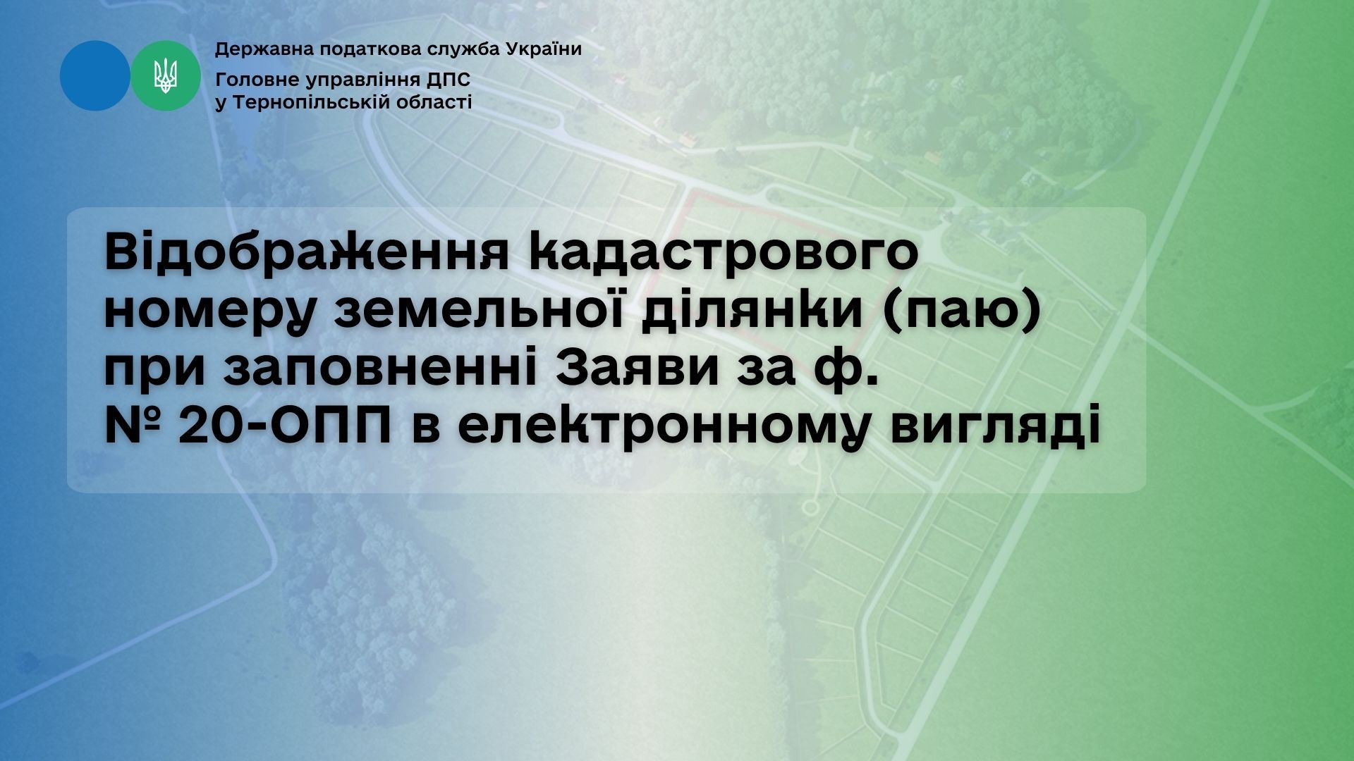 Отже, якщо платник податків подає заяву за формою № 20-ОПП в електронному вигляді, то у графі 17 розділу 3 потрібно зазначити кадастровий номер земельної ділянки або паю саме в тому вигляді, у якому він внесений до Державного земельного кадастру – з дотриманням усіх цифр, символів, двокрапок, пробілів та інших елементів нумерації.