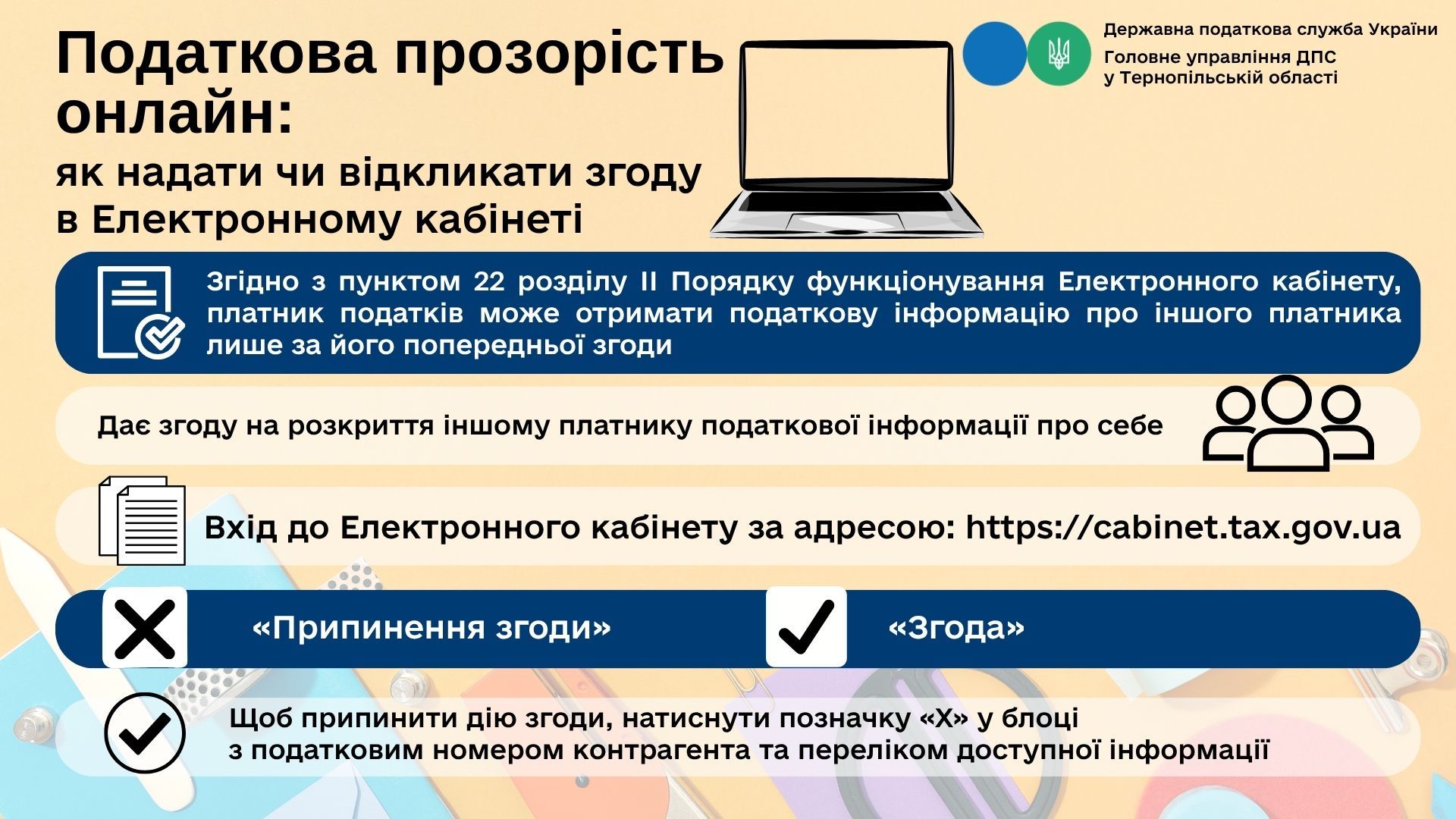 Відповідно до пункту 23 цього ж Порядку, платник податків може самостійно дозволити іншому платнику отримати інформацію про себе, визначивши, які саме дані можна розкривати. Для цього потрібно через Електронний кабінет подати згоду на розкриття податкової інформації у визначеному обсязі.