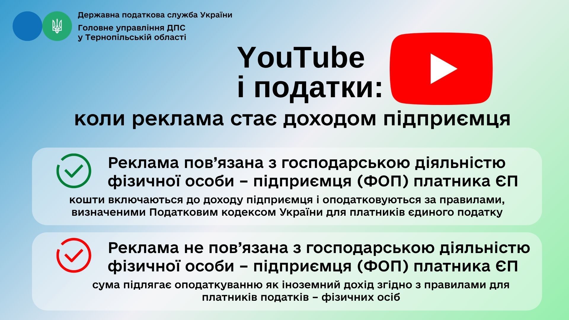 Згідно з главою 1 розділу XIV Податкового кодексу України, якщо реклама, розміщена YouTube, пов’язана з господарською діяльністю фізичної особи – підприємця (ФОП), який є платником єдиного податку, то отримані кошти включаються до його підприємницького доходу.