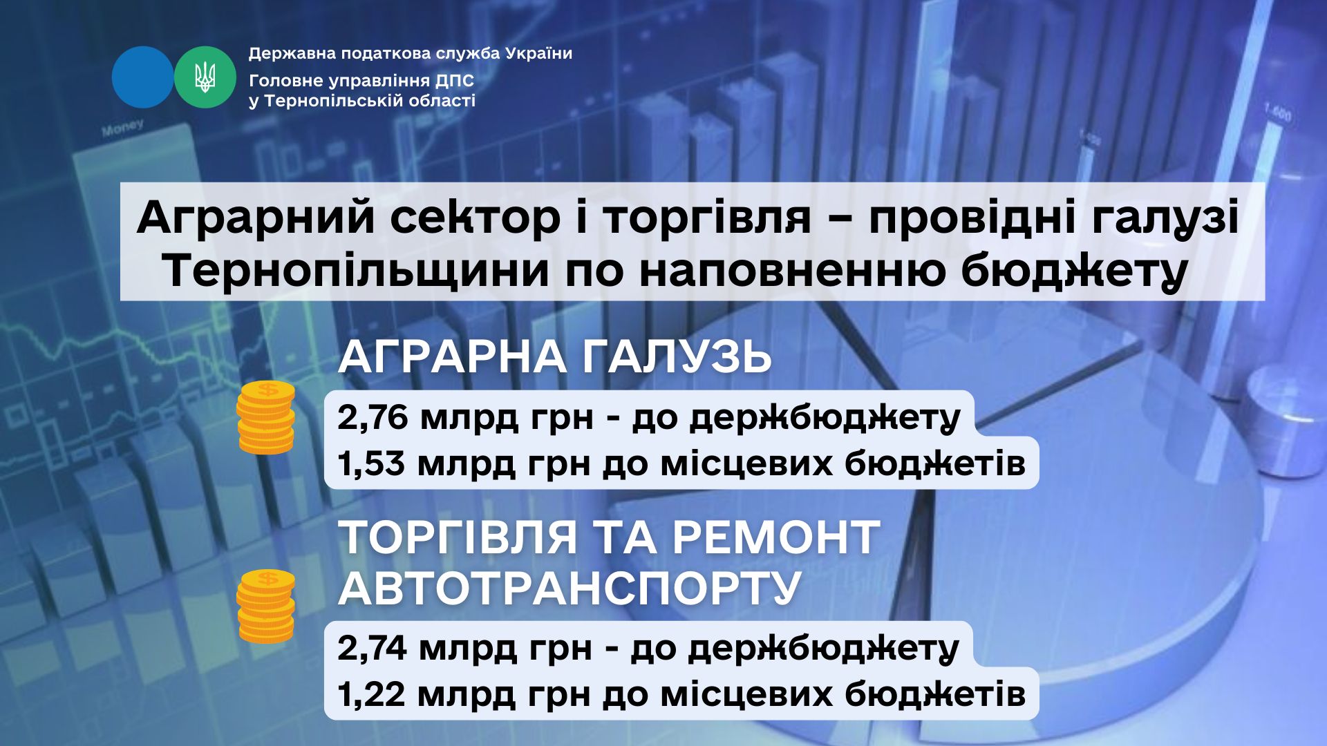 У січні-жовтні цього року п’ять провідних галузей економіки забезпечили понад 11,7 млрд грн надходжень до зведеного бюджету України, що становить 69% усіх платежів, мобілізованих Головним управлінням ДПС у Тернопільській області. Лідером із формування доходів став аграрний сектор, за яким розташувались торгівля, державне управління та оборона, переробна промисловість і транспортна сфера.