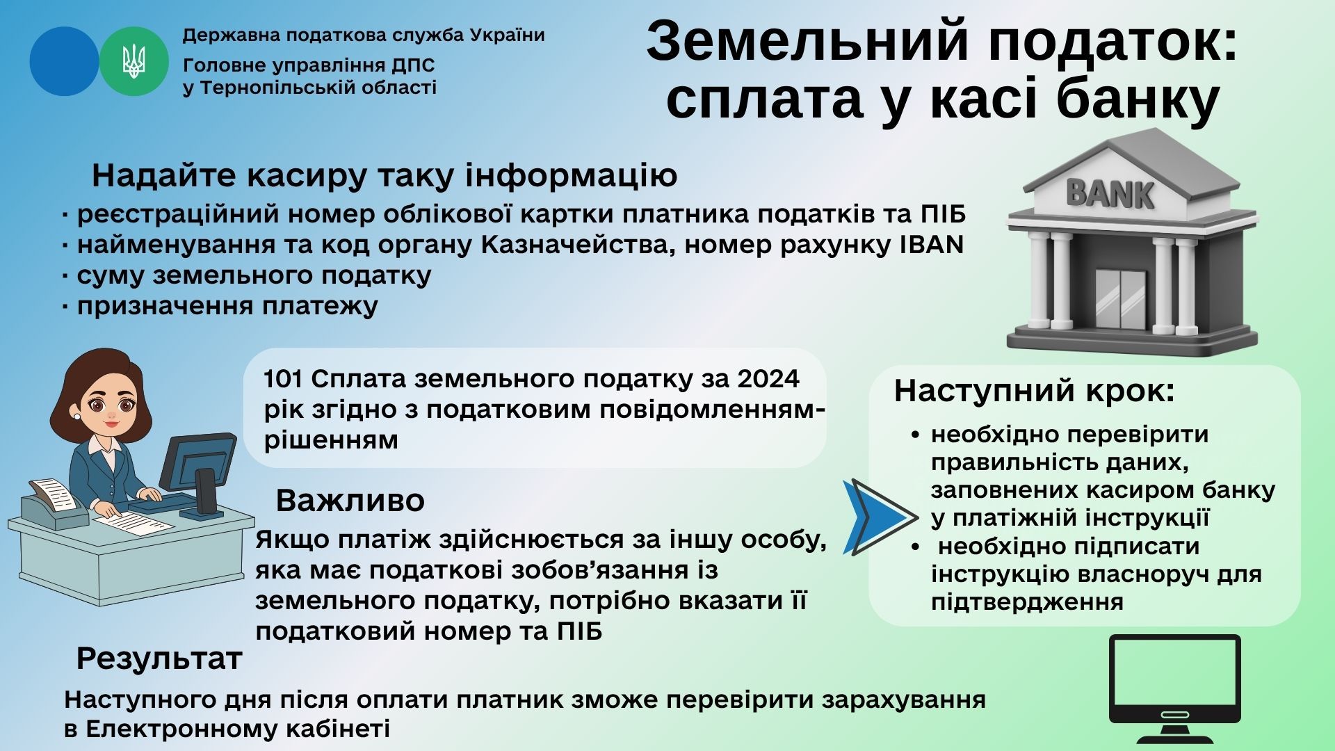 ГУ ДПС у Тернопільській області нагадує: громадяни можуть сплатити земельний податок у касі банківської установи.
