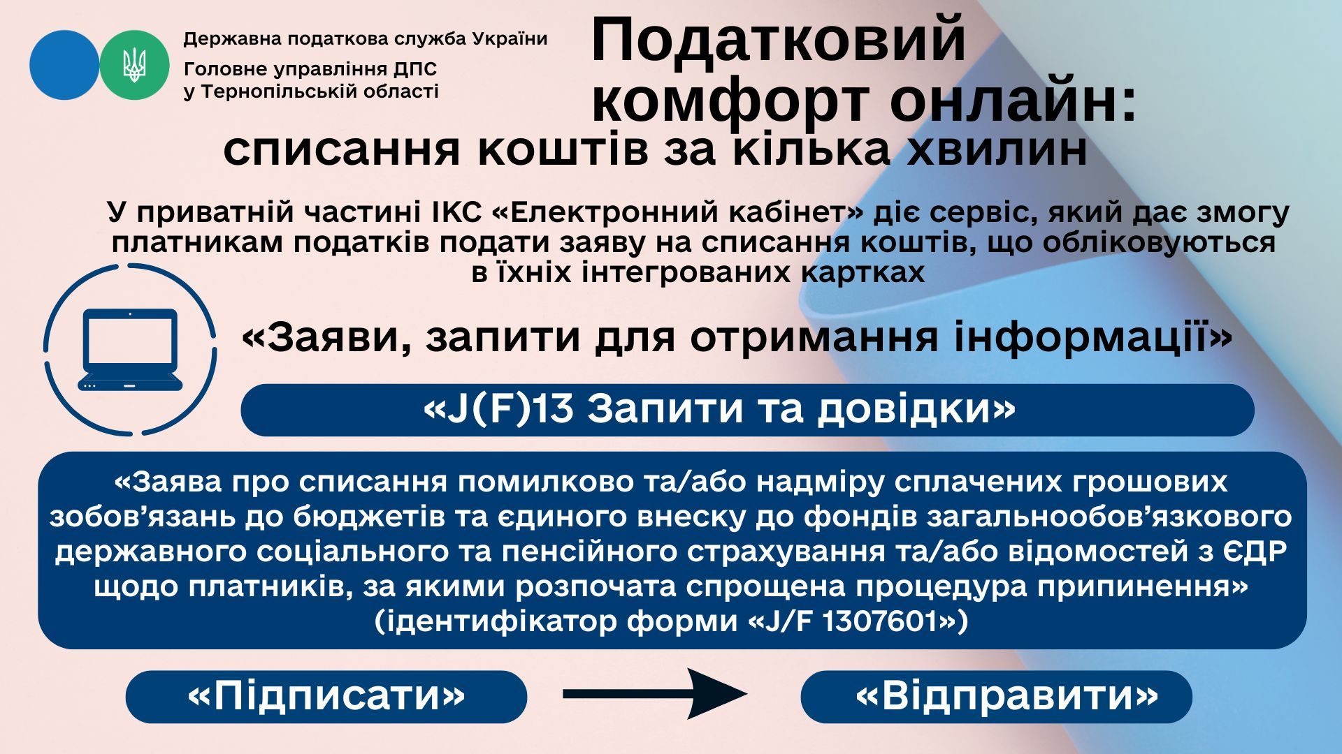 Головне управління ДПС у Тернопільській області повідомляє, що в приватній частині ІКС «Електронний кабінет» діє сервіс, який дає змогу платникам податків подати заяву на списання коштів, що обліковуються в їхніх інтегрованих картках.