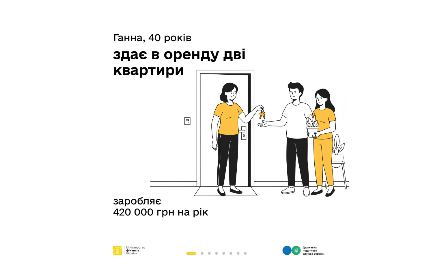 Отже, 40-річна Ганна має кілька однокімнатних квартир, дві з яких здає в оренду. За квартиру в столиці щомісяця вона отримує 20 тис. грн, а за квартиру в Ужгороді – 15 тис. грн (загалом 105 тис. грн/квартал; 420 тис. грн/рік). З метою отримання офіційного доходу  Ганна зареєструвала свою діяльність як ФОП (фізична особа – підприємець) 3 групи єдиного податку. Це дозволяє їй офіційно надавати послуги з оренди громадянам України та іноземцям.