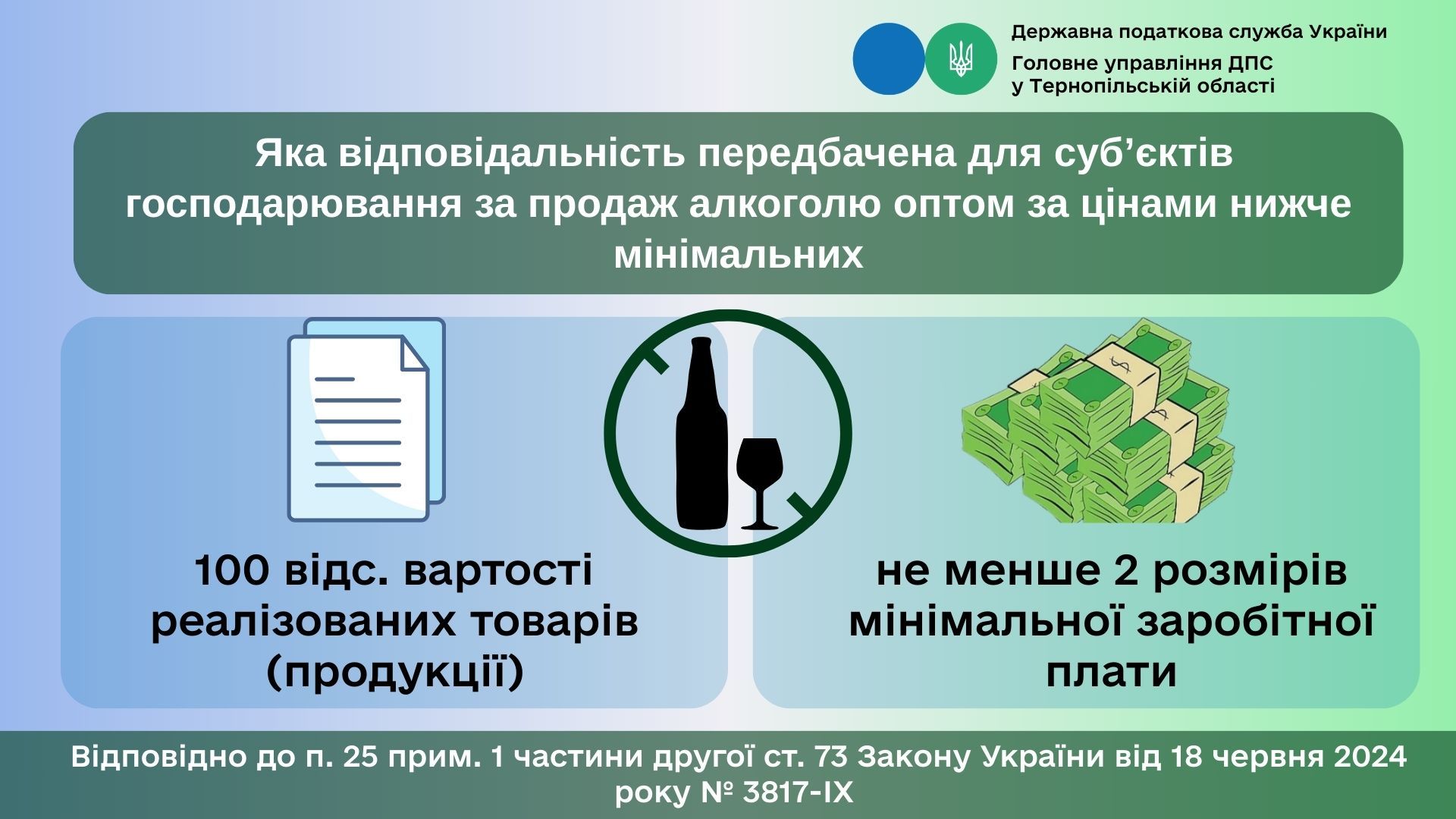 Відповідно до п. 25 прим. 1 частини другої ст. 73 Закону України від 18 червня 2024 року № 3817-IX «Про державне регулювання виробництва і обігу спирту етилового, спиртових дистилятів, біоетанолу, алкогольних напоїв, тютюнових виробів, тютюнової сировини, рідин, що використовуються в електронних сигаретах, та пального» до суб’єктів господарювання за вчинені правопорушення застосовуються фінансові санкції у вигляді штрафу.