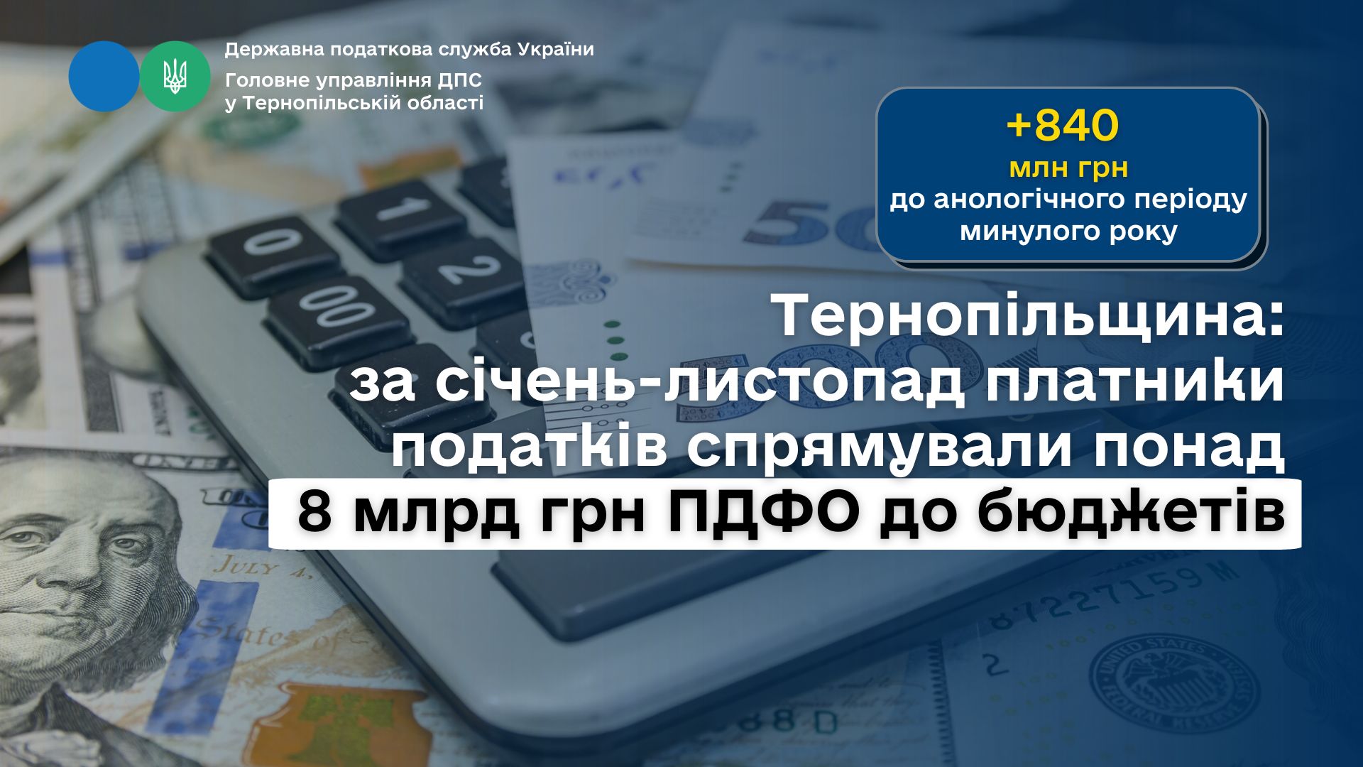 Упродовж січня-листопада цього року платники податків Тернопільської області перерахували до Зведеного бюджету України 8 мільярдів 47 мільйонів гривень податку на доходи фізичних осіб (ПДФО). Це на 840 мільйонів гривень більше, ніж за відповідний період минулого року.