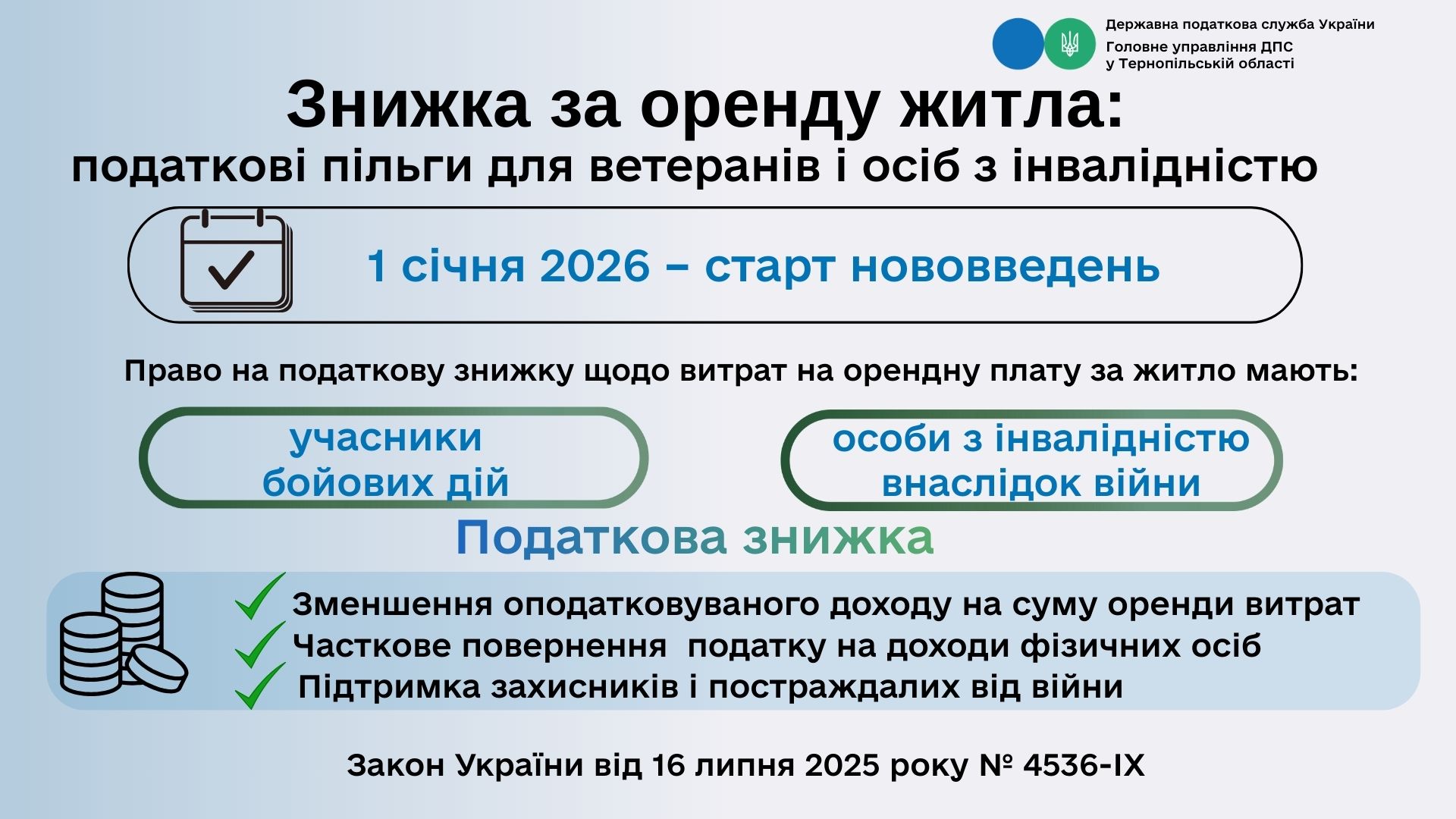 Відтепер право на податкову знижку щодо витрат на орендну плату за житло – квартиру або житловий будинок – отримали також учасники бойових дій та особи з інвалідністю внаслідок війни. Відповідні категорії громадян включено до кола осіб, які можуть зменшити свій оподатковуваний дохід на суму фактично понесених витрат на оренду.