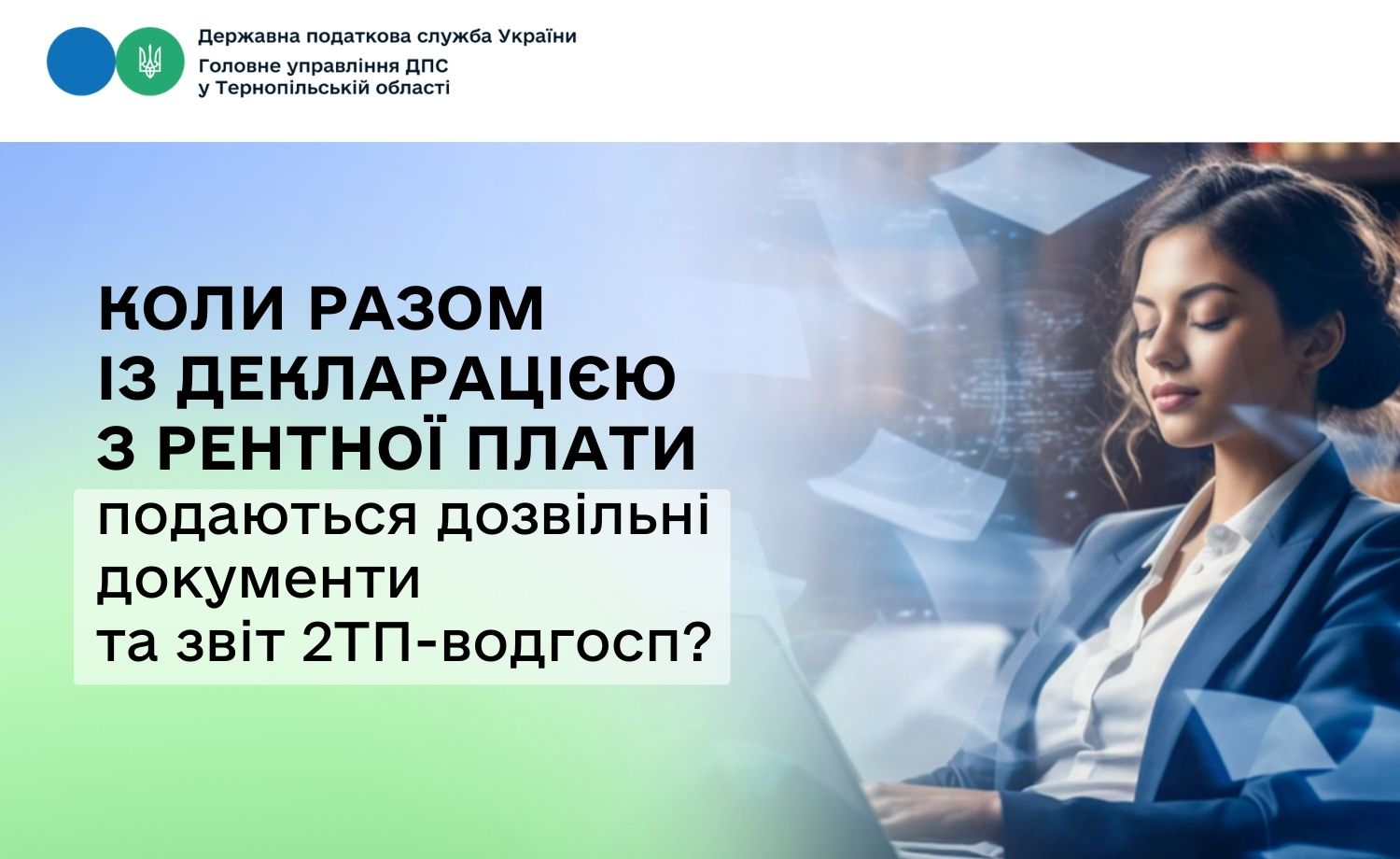 Державний облік водокористування здійснюється відповідно до наказу Міністерства екології та природних ресурсів України від 16.03.2015 № 78. Водокористувачі подають звіт за формою № 2ТП-водгосп (річна) в електронному вигляді через Портал Дія або портал електронних послуг Держводагентства. Звітним періодом є календарний рік, а подати його потрібно не пізніше 1 лютого року, що настає за звітним.