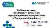 Головне управління ДПС у Тернопільській області повідомляє, що 3 жовтня 2025 року о 10 годині заплановано проведення online-заходу на платформі ZOOМ на тему: «Особливості діяльності Офісу податкових консультантів у Тернопільській області» в рамках роботи комунікаційної платформи Тернопільської ОВА «Діалог влади та бізнесу»