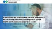 Таким чином, після внесення запису до Єдиного державного реєстру юридичних осіб, фізичних осіб – підприємців та громадських формувань про припинення юридичної особи, така особа подає до контролюючого органу останню Декларацію за податковий (звітний) квартал, в якому проведено державну реєстрацію припинення юридичної особи, наростаючим підсумком з початку року (квартал або півріччя або 9 місяців або рік) до закінчення такого податкового (звітного) періоду або протягом 40 календарних днів, що настають за останнім календарним днем податкового (звітного) періоду, у паперовому вигляді.